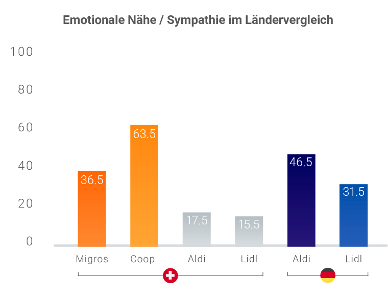 Dort werden Aldi und Lidl, anders als in der Schweiz, als emotional nahe und sympathisch wahrgenommen. Insbesondere bei Aldi drückt dies stark durch.