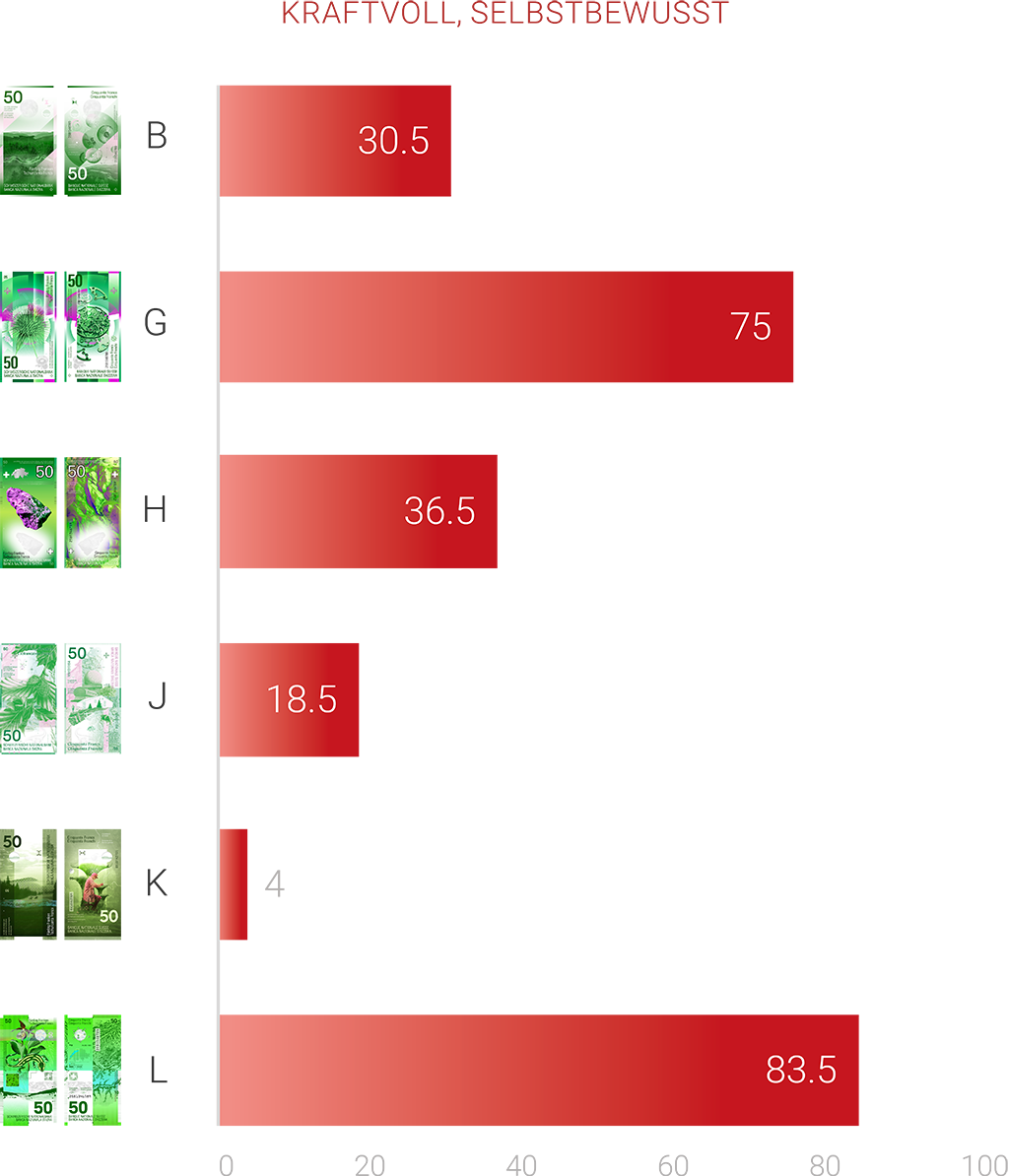 Wahrgenommene Kraft der Banknotenkonzepte: Konzept L wirkt am kraftvollsten – gefolgt von G und H.