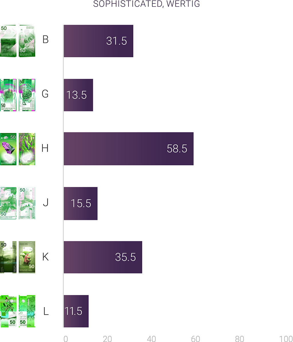 Wahrgenommene Wertigkeit der Banknotenkonzepte: Konzept H wirkt am edelsten und durchdachtesten – vor K und B.