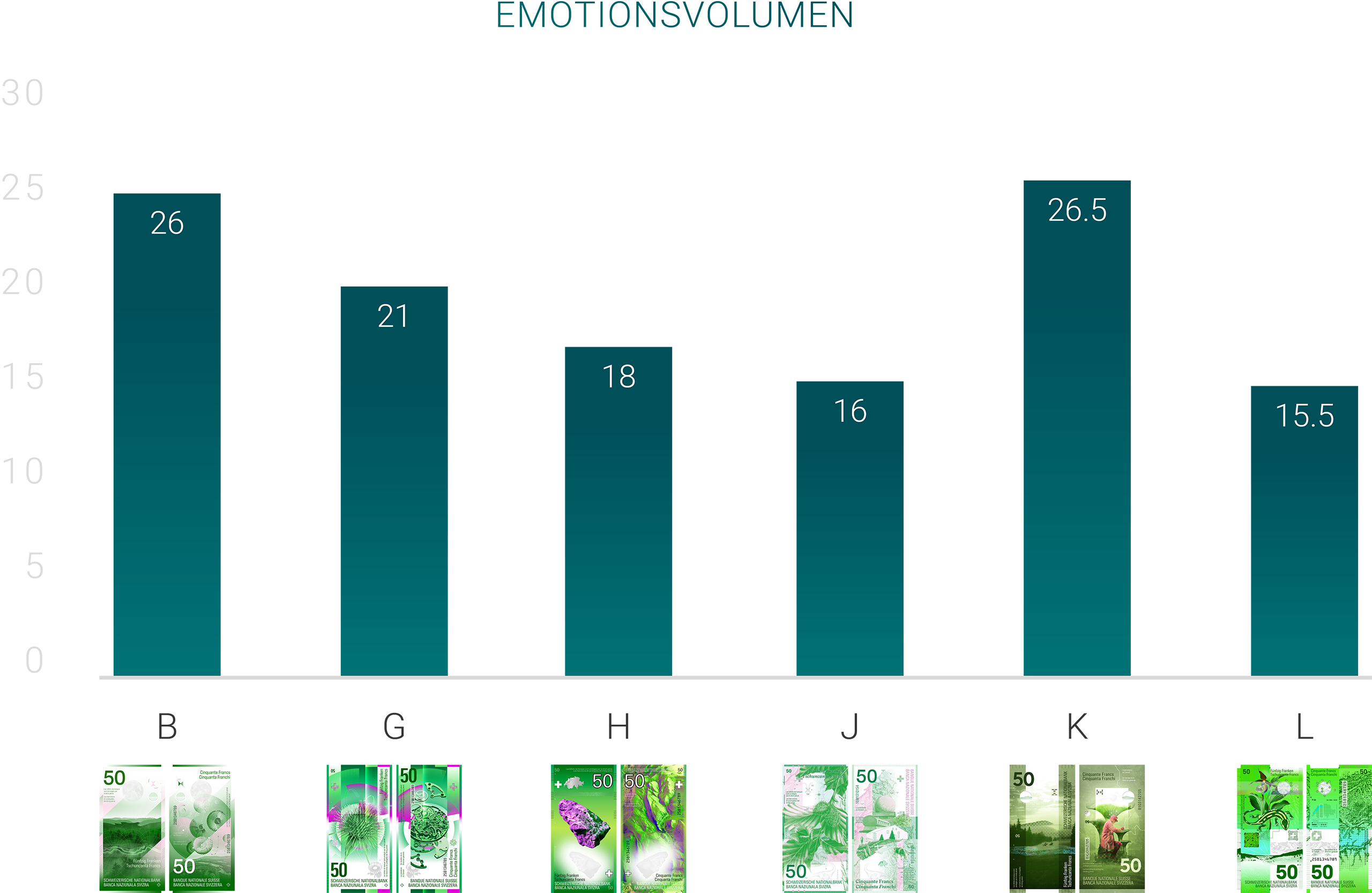 Gesamtes Emotionsvolumen der Banknotenkonzepte: Konzepte K und B lösen am meisten Emotion aus.