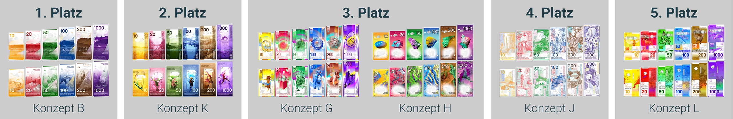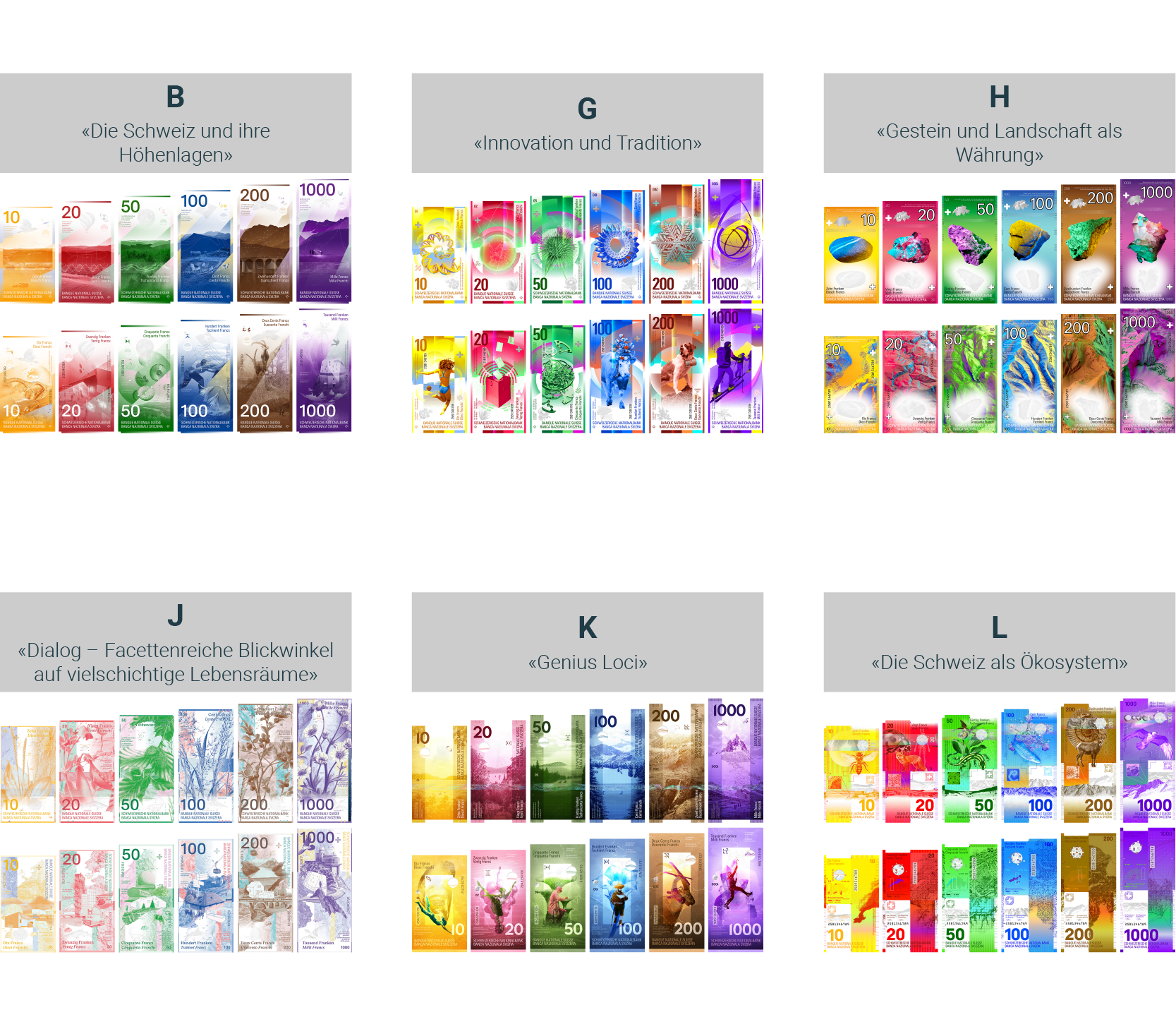 Übersicht der sechs untersuchten Banknotenkonzepte B, G, H, J, K und L