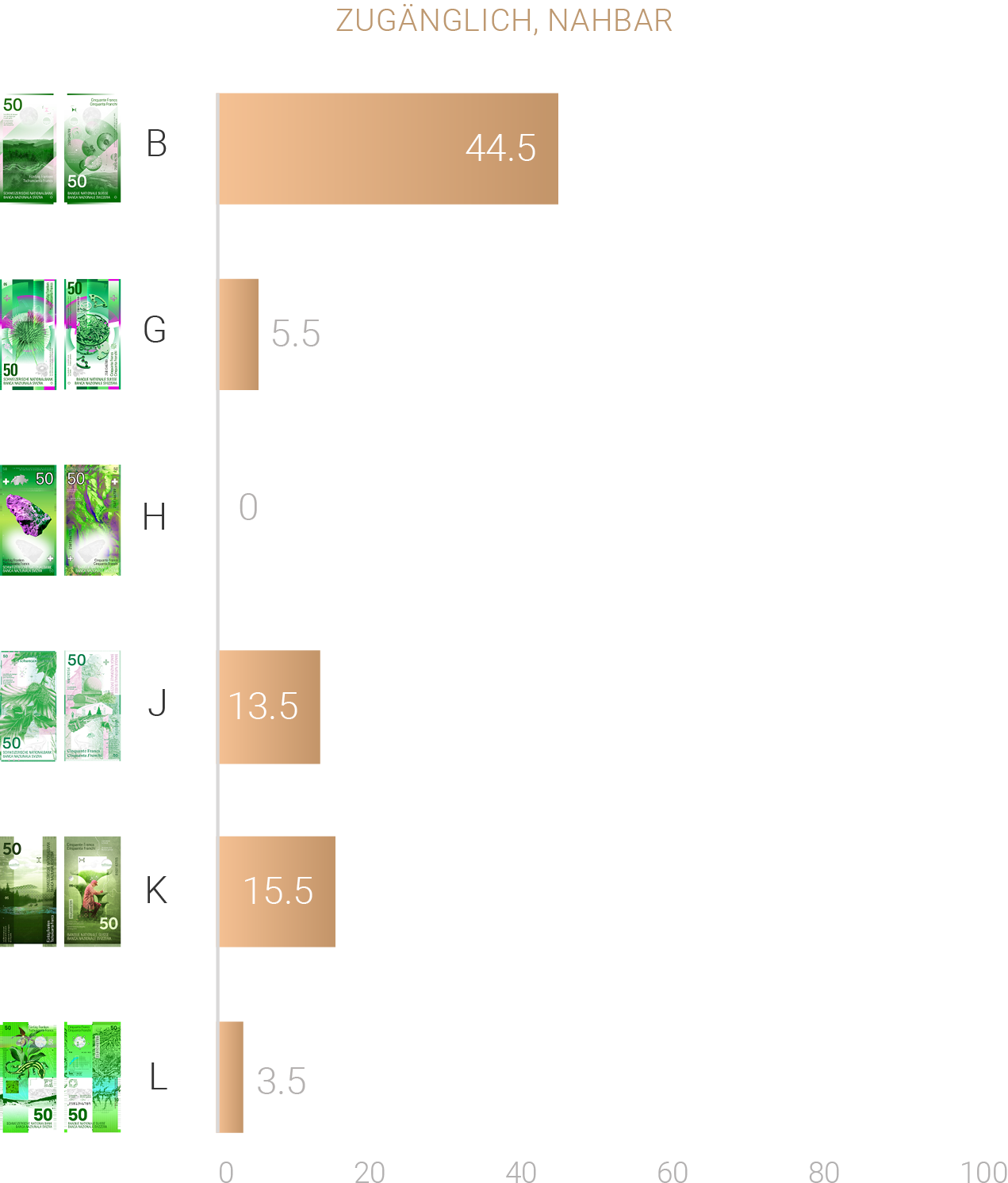 Gesamtrangliste der Banknotenkonzepte: Konzept B überzeugt emotional am stärksten – vor K, G und H.